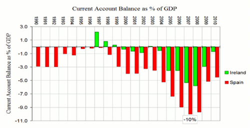 Kuvio 2 osoittaa, miten Irlannin ja Espanjan maksutasealijäämät kasvoivat euron käyttöönoton jälkeen jyrkästi ulkomaisen lainaamisen lisääntymisen myötä. Varsinkin Saksan säästämisylijäämä virtasi muihin matalasta reaalikorosta hyötyviin, korkeamman inflaation euromaihin, kuten juuri Espanjaan ja Irlantiin. Uusien lainavarojen runsaus kanavoitui holtittomilla rahoitusmarkkinoilla huonoihin investointeihin, mikä näkyi muun muassa kiinteistömarkkinoiden hintakuplassa. Kuplan puhkeamisesta seurasi yksityisten velkojen sosialisointi holtittomasti käyttäytyneiden pankkien pelastamiseksi (bail out), mistä puolestaan seurasi näiden maiden julkisen velan kasvu.