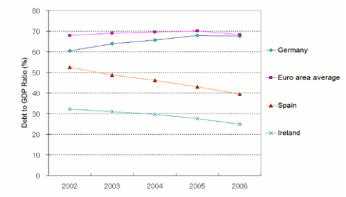 Huomionarvoista kuitenkin on, että ennen vuoden 2008 finanssikriisiä Irlannin ja Espanjan julkistalous oli ylijäämäinen, toisin kuin Saksassa. Kuviosta 3 nähdään miten julkisen velan BKT-osuus on kehittynyt euroaikana kriisivuosiin tultaessa.
