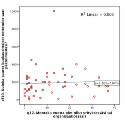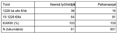 Aineiston analyysin mukaan itsensä työllistäjien luokka-asema uusiutuu, eikä monikaan nouse heistä varsinaisiksi kapitalisteiksi, mutta monet tekevät kuitenkin pitkän työuran. Työuran edetessä itsensä työllistäjien tulotilanteet ennemminkin tasoittuvat samalle matalalle tasolle kuin lähtevät nousuun. Aineistossa ei löydy juuri lainkaan lineaarista korrelaatiota toimivuosien ja tulotilanteen välillä (ks. kuvio 1). Itsensä työllistäjien tilanteeseen liittyy palkansaajia suurempi tulotason laskun riski; kysyttäessä tulotason muutosta nähden edelliseen vuoteen jopa neljännes itsensä työllistäjistä vastasi tulojensa huvenneen, kun palkansaajista näin oli vastannut vain joka kymmenes.