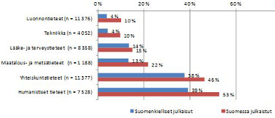 Useimmilla luonnon- ja lääketieteen aloilla tutkimuskohteet ovat universaaleja. Esimerkiksi fysiikan lait tai solujen fysiologiset ominaisuudet pätevät kaikkialla maailmassa, ja samaa tutkimuskohdetta voidaan tutkia missä tahansa riippumatta esimerkiksi kulttuurisista tai maantieteellisistä eroista. Näillä aloilla kansainväliset lehdet ovat pääasiallinen julkaisukanava (ks. Kuva 1). Humanistisissa tieteissä ja yhteiskuntatieteissä puolestaan tutkimusaiheet ovat usein luonteeltaan paikallisia. Suomen historiaa, Suomen lakia tai suomalaista sosiaalihuoltojärjestelmää koskeva tutkimus kerää monesti enemmän kiinnostusta Suomessa kuin ulkomailla.