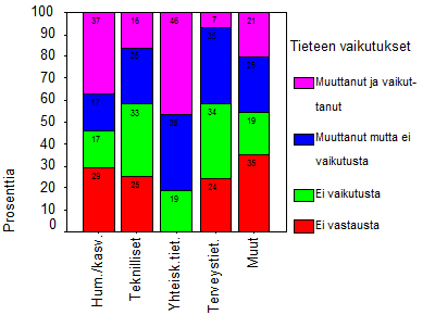 Tieteen harjoittamisen vaikutuksilla elämään on tilastollisesti merkitsevä yhteys tieteenalaan (p=0.001). Kuten kuvio 4 osoittaa, teknillisten tieteiden edustajissa ja lääketieteilijöissä on suhteellisesti eniten niitä, jotka arvioivat, ettei tieteen harjoittamisella ole ollut vaikutusta heidän elämäänsä. Vastaavasti yhteiskuntatieteilijät ja humanistit / kasvatustieteilijät kokevat, että tiede on muuttanut heidän maailmankuvaansa, ja tämä muutos myös näkyy ja tuntuu jokapäiväisen elämän tasolla. Tosin yhteiskuntatieteilijöissä on runsaasti myös niitä, jotka arvioivat tieteen harjoittamisen muuttaneen käsityksiä maailmasta, mutta ei arkipäivän tasolla juurikaan vaikuttaneen elämään.