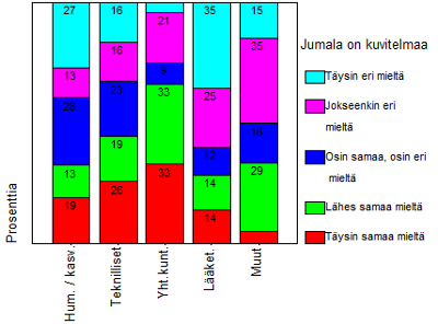 Jumalaan uskomista koskevan kategorianvalintatehtävän perusteella yhteiskuntatieteilijöissä on ateisteja 47 % ja agnostikkoja 31 %, teknillisten tieteiden edustajista vastaavasti 42 % ja 29 %. Kategorianvalintatehtävässä teologit, kasvatustieteilijät, kauppatieteilijät ja lääketieteilijätkin ovat selkeältä enemmistöltään Jumalaan uskovia (lääketieteilijöistä 58 % valitsee annetuista vaihtoehdoista ne, mitkä ilmentävät jonkinlaista uskomista, ja vastaavasti ateisteihin ja agnostikkoihin heistä lukeutuu 42 %).