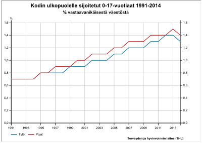 Avaan seuraavassa varsin yksinkertaista ja laajasti käytettyä lastensuojeluindikaattoria, joka kuvaa kodin ulkopuolelle sijoitettujen 0–17-vuotiaiden lasten ja nuorten suhteellista osuutta vastaavan ikäisestä väestöstä (Alastalo & Pösö 2011; 2014). Indikaattori löytyy kahdesta keskeisestä suomalaisesta indikaattoripankista, jotka ovat valtioneuvoston kanslian ja Tilastokeskuksen ylläpitämä, yhteiskunnan kehitystä ja keskeisiä ilmiöitä kuvaava Findikaattori sekä THL:n ylläpitämä, hyvinvointia ja terveyttä kuvaava Sotkanet. Näistä indikaattoripankeista Findikaattori on suppeampi, sillä se sisältää vain satakunta indikaattoria yhteiskunnan eri alueilta. Sotkanet sen sijaan on valtava aihealueittain ryhmiteltyjä tilastoja ja indikaattoreita sisältävä sivusto. Sotkanetista löytyy myös eri politiikkaohjelmien seurantaindikaattoreita.
