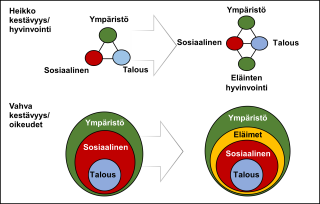 Aiemmin on jo ehdotettu (esim. Rawles, 2010), että perinteistä kestävän kehityksen määritelmää täydennettäisiin eläinten hyvinvointiulottuvuudella (kuvio 1, ylärivi). Hieman samantyyppinen on yli 200 asiantuntijan ehdotus sisällyttää eläinten hyvinvointi kestävän kehityksen hallintaan (ks. myös Verkuijl et al., 2022). Tällöin kyse on niin sanotusta heikosta kestävyydestä, joka esittää kaikki osa-alueet toisistaan riippumattomina eikä huomioi eläinten oikeuksia. Oma ehdotuksemme (kuvio 1, alarivi) pohjautuukin ekologisten taloustieteilijöiden vahvan kestävyyden malliin, jossa eri ulottuvuudet on esitetty sisäkkäisinä ympyröinä (ks. esim. Giddings ym. 2002). Tämän mallin logiikka on sama kuin SDG-tavoitteiden ”hääkakussa” eli tarkoitus on havainnollistaa, että talous on vain yksi yhteiskunnasta riippuvainen osajärjestelmä ja yhteiskunta puolestaan on riippuvainen ympäröivästä luonnosta. Muunlajiset eläimet sijoittuvat tässä mallissa yhteiskunnan ja ympäristön väliin korostaen luontevasti sitä, että ihminen on yksi laji muiden joukossa.