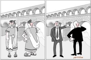 Kuva 1. Vettä on johdettu kaukaa kaupunkien käyttöön jo roomalaisten ajoista lähtien. Kestävätkö nykyiset putket yhtä kauan kuin akveduktit? (Piirros: Pertti Väyrynen)
