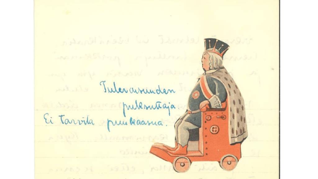 Kuva 3. Kirjeissä kulki mukana pikkulahjoja kuten kiiltokuvia ja kirjepaperi valittiin huolella. Erikoispaperistakin ja musteesta alkoi lopulta olla pulaa. Kirjeisiin sisältyi humoristisia viittauksia sota-ajan olosuhteisiin.