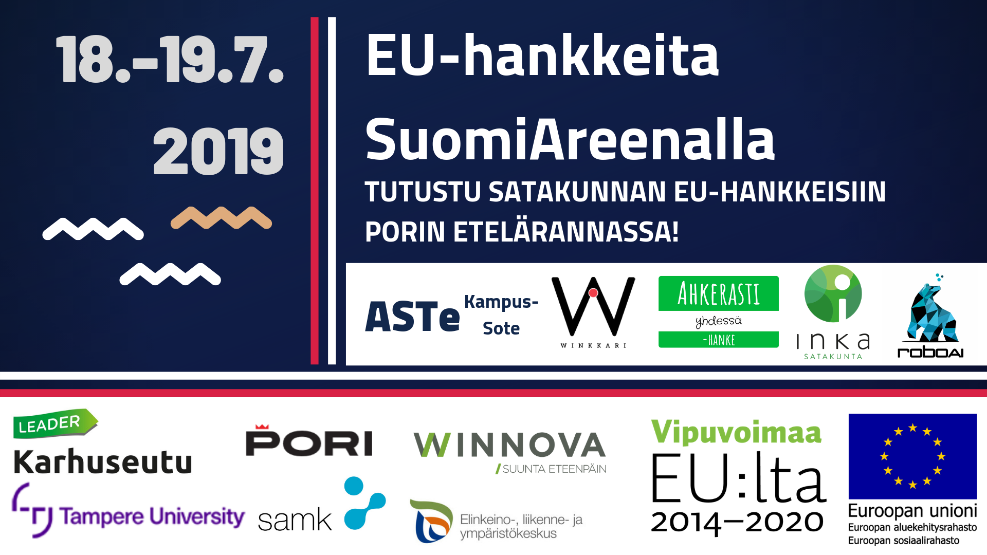 Torilta löytyivät kahden päivän aikana Tampereen yliopiston (yhteiskuntatieteet, Pori) ASTe- ja Kampus-Sote -hankkeet, Satakunnan ELY-keskuksen hallinnoima INKA – Innovatiiviset kasvupalvelut Satakunnassa –hanke, Leader Karhuseudun Ahkerasti yhdessä -hanke, Winnovan Winkkari-hanke sekä SAMK:n hyvinvointiteknologiahankkeet. Satakuntalaisten EU-hankkeiden teltta sijaitsi Etelärannassa, jossa SuomiAreena-lavan ohjelmasta vastasi torstaina yhteensopivasti koulutusteemaisella sisällöllä Opettajien ammattijärjestö OAJ. Ja tarjosihan ranta myös näkymän suoraan Puuvillassa sijaitsevaan Porin yliopistokeskukseen!