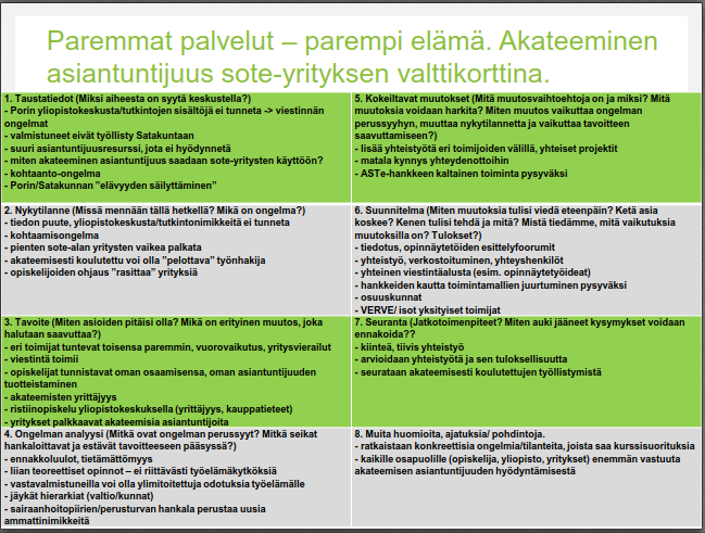 ASTe-hankkeen työpajassa tavoitteena oli pohtia aiemmin kuullun alustuksen johdattelemana syvemmin yliopisto-opiskelijoiden ja sote-alan välistä yhteistyötä, analysoida sen haasteita ja tuottaa ratkaisuehdotuksia. Osallistujina oli perustutkinto- ja jatko-opiskelijoita sekä työelämän edustajia – tahoja, joita varten ASTe-hankkeen kehittämistyötä tehdään. Yhteistyön haasteiksi ja esteiksi tunnistettiin muun muassa se, ettei Porin yliopistokeskuksen opiskelijoiden (generalista) osaamista välttämättä tunnisteta, eivätkä osaamistarpeet ja opiskelijoiden asiantuntijuus kohtaa. Niihin liittyen keskeinen kehittämiskohde on viestintä. ASTe-hankkeelle työpaja toi vahvistusta sekä hankkeen aikana rakentuneille näkemyksille yliopisto-opintojen aikaisesta työelämäyhteistyöstä, että kehittämistyön suunnalle.