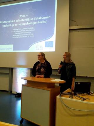 ASTe-hankkeen kommenttipuheenvuorossa ”Porin yliopistokeskuksen opiskelijoiden monitieteinen asiantuntijuus Satakunnan sote-palvelujen tueksi” projektipäällikkö Eveliina Kaukkila ja projektipäällikkö Vilma Wiro kertoivat ASTe-hankkeen kehittämistyön lähtökohtana olevasta satakuntalaisten yliopisto-opiskelijoiden tai –koulutettujen ja sote-alan välisestä kohtaanto-ongelmasta sekä Porin yliopistokeskuksen opiskelijoiden asiantuntijaprofiilista ja sen potentiaalista hyvinvoinnin ja hyvinvointipalveluiden kehittämisen monitieteisenä tukena.