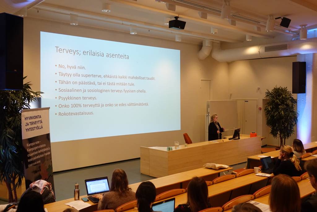 Heidi Luotolahti-Pitkäranta on erikoislääkäri ja toimii Porin perusturvan sairaalapalveluiden ylilääkärinä. Hän piti asiantuntijapuheenvuoronsa otsikolla ”Terveys, sairaus ja hyvinvointi: Erilaisia ajattelutapoja ja samanlaisia hahmotuksia eri ammattiryhmien kesken”. Luotolahti-Pitkäranta käsitteli esityksessään esimerkiksi esimiehen roolia organisaation toimintakulttuurissa ja nosti esiin käytäntöön ja kokemuksiin perustuvia esimerkkejä siitä, miten sote-alan ammattilaiset voivat asiakas- ja potilaskohtaamisissa vahvistaa tietynlaista asennoitumista. Parhaimmillaan toiminta johtaa positiiviseen spiraaliin, jossa huomiota kiinnitetään – tosiasiat tunnustaen – mahdollisuuksiin ja voimavaroihin. Tampereen yliopiston Porin yksikön (yhteiskuntatieteet) sosiaalityön apulaisprofessori Riikka Korkiamäki totesikin esityksen jälkeisessä keskustelussa, että sanomassa oli paljon yhtymäkohtia hänen kollegoidensa kehittämään myönteisen tunnistamisen työotteeseen.