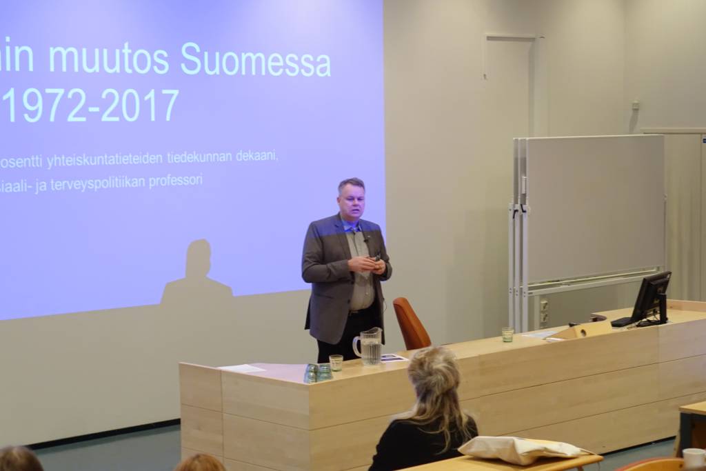 Tampereen yliopiston yhteiskuntatieteiden tiedekunnan dekaani, dosentti, sosiaali- ja terveyspolitiikan professori Juho Saari piti puheenvuoronsa otsikolla ”Hyvinvoinnin muutos Suomessa 1972 – 2017”. Hänen esitelmänsä käsitteli tutkimusprojektia, jossa suomalaisen sosiologi Erik Allardtin 1970-luvulla toteuttama Hyvinvoinnin ulottuvuudet -klassikkotutkimus toistettiin 2010-luvun Suomessa. Saari kertoi projektin lähtökohdista eli Allardtista ja hänen tunnetusta hyvinvoinnin ulottuvuuksien teoriastaan. Hän käsitteli myös tutkimuksen toistamiseen liittyviä haastavia ja pohdintaa vaatineita kysymyksiä. Luennolla pohdittiin, kestääkö kysely aikaa; miten esimerkiksi vallitsevat ymmärrykset käsitteiden sisällöistä saattavat muuttua tai miten tulisi huomioida muuttuneet aineiston keruun ja analysoinnin tavat. Puheenvuoron aikana kuultiin myös muutamia nostoja tutkimustuloksista, liittyen esimerkiksi ihmisten onnellisuuden kokemuksiin ja käsityksiin yhteiskunnallisista ristiriidoista sekä sairastavuuteen ja lääkkeiden käyttöön. Tutkimus valottaa mielenkiintoisella tavalla hyvinvoinnin muutoksia, mutta myös pysyvyyksiä 50 vuoden aikavälillä.