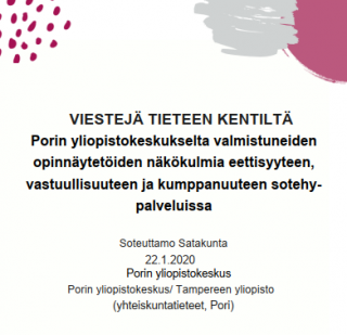 ASTe-hanke kokosi Soteuttamo Satakunta -tilaisuutta varten tieteenrajat ylittävästi tietoa sellaisista Porin yliopistokeskuksella toimivista tutkinto-ohjelmista valmistuneista pro gradu- ja diplomitöistä, jotka syventävät ja laajentavat näkökulmia tilaisuuden teemaan. ”Viestejä tieteen kentiltä: Porin yliopistokeskukselta valmistuneiden opinnäytetöiden näkökulmia eettisyyteen, vastuullisuuteen ja kumppanuuteen sotehy-palveluissa” -julkaisu sisältää tiivistelmät kymmenestä pro gradu -tutkielmasta kahdesta eri yliopistosta ja useista tutkinto-ohjelmista. Opinnäytetyöt on jaoteltu neljään pääteemaan: Arvojen ja eettisyyden tarkastelua, yritykset, yrittäjyys ja vastuullisuus; vastuullisuus näkyvämmäksi sekä yhteistyötä ja kumppanuuden kerroksia.