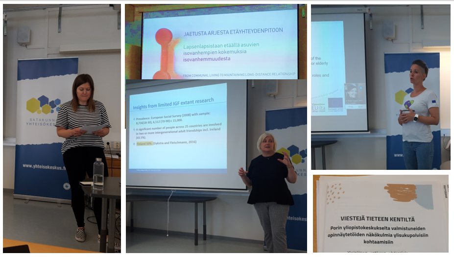Yhteiskuntatieteiden maisteri (sosiologia) ja Tampereen yliopiston (yhteiskuntatieteet) Porin yksikössä Kulttuurisuunnittelu ja yhteiskehittäminen mukaan kuulumisen ja deliberatiivisen aktiivikansalaisuuden edistäjinä –tutkimusyhteistyöhankeessa työskentelevä Tellu Rosenqvist toteutti puheenvuoronsa etäisovanhemmuutta käsittelvän pro gradu –tutkielmansa pohjalta. Rosenqvist toi esiin isovanhemmuuden, sen esteiden ja mahdollisuuksien rakentumista isovanhempien kirjoituksista muodostuneessa aineistossa. Puheenvuoro herätti vilkasta keskustelua – ilmiö koskettaa monia. Mielenkiintoisia jatkotutkimuskysymyksiä heräsi etäisyyden kokemuksesta, sillä se osoittautui hyvin vaihtelevaksi.