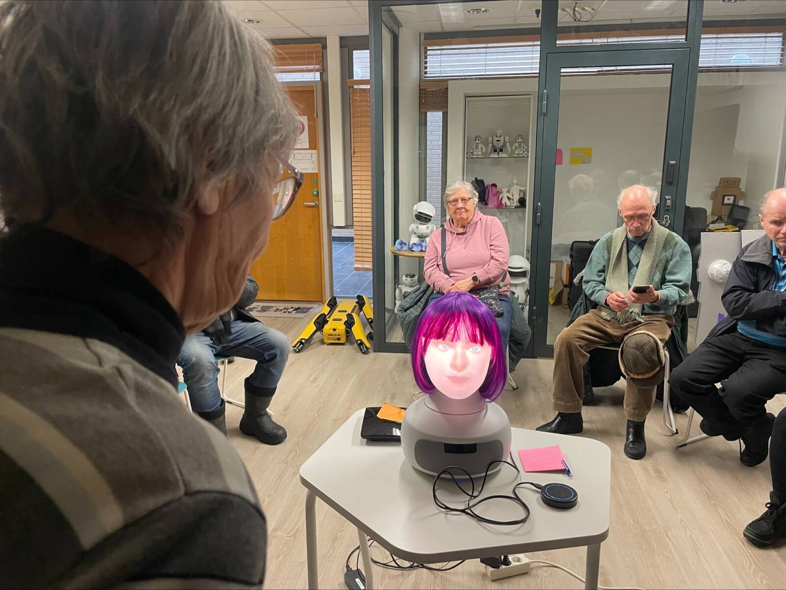 ATK Seniorit Mukanetti ry järjestää ikäihmisille koulutusta sekä ohjausta tietokoneiden, tablettien ja kännyköiden käyttöön. Digitukea antavat vertaisohjaajat. 15 vertaisohjaajaa vieraili Robostudiolla tutustumassa robotteihin 4.3.2024. Miten seniorit päätyivät Robostudioon? Mukanetin koordinaattori Anu Koivula osallistui Tiedon Valoa tapahtumaan Tampere-talossa, äkkäsi sieltä Robostudion robotit, ja kyseli mahdollisuutta vierailuun meidän Human-Technology Interaction opiskelijan Veronikan kautta. Saimme vierailun yhdistettyä sopivasti meneillään olevaan akatemiahankkeeseemme MediaRoboLit65+ ja käynnistä muodostuikin kiinnostava robottilukutaitoa toivottavasti edistävä tapaaminen.