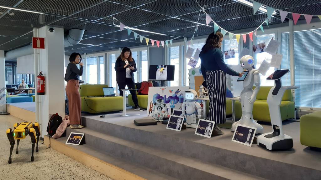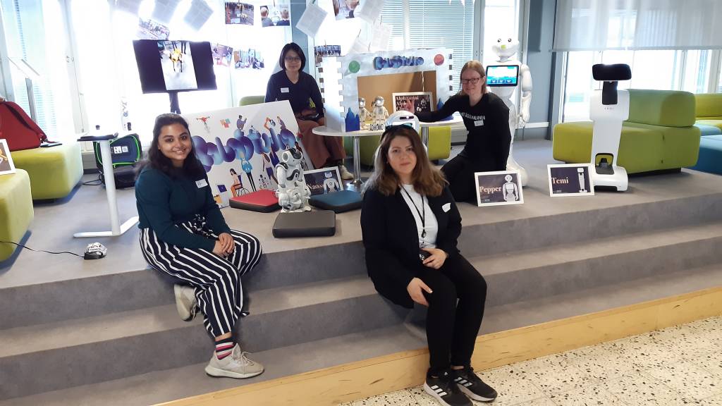 The visitors stopped on our station after visiting Robolab. We first introduced ourselves and told about Robostudio and our work in education, research and societal impact. We introduced our robots and the visitors had a chance to interact with Spot and Pepper. They also heard some stories about our activities, for example: