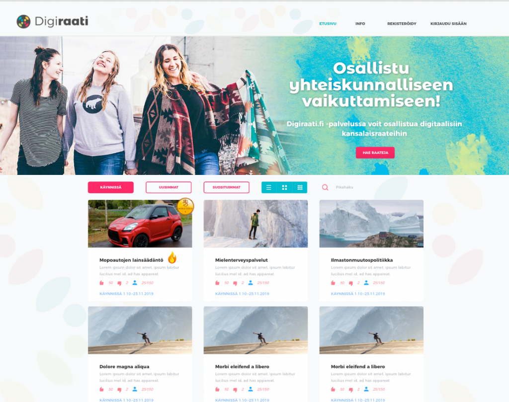 The prototype testing began in February 2020. Tests have included a week long use period in each council. Altogether five different test councils were facilitated with almost 50 participants. Prototype tests will provide more understanding on the user experience and digital participation related themes such as anonymity, discussed themes, needs for supporting materials, feelings of safety, and polarization of power and voice in the councils. Preliminary results suggest that generally among the test participants Virtual Council has been experienced as a positive and potential tool to enable participation in discussions with the decision makers, especially if the subject is interesting. It is also important that after a council is finished, the participants receive feedback on how their contribution has been included in for instance the made decisions.