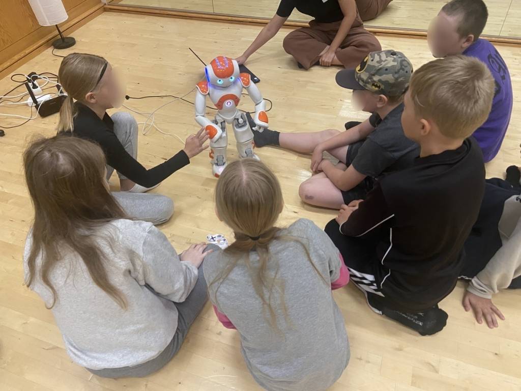 Supported by the project AI Hub Tampere, we conducted a 2-hour study at a summer camp at Varalan Urheiluopisto which had an amazing opening by introducing ourselves, activities of the day, and most importantly, asking pupils what they think a robot is. The introductory session was interactive, and we received responses from the pupils. For example, when asking what is a robot, some of the pupils commented that: ’Se on sähköinen laite joka tekee jotain. Esimerkiksi: imuroida’ = ’It is an electrical device that does something. For example: hoover’. After warming up and getting to know each other, the pupils were divided into three groups and circulated between three robot stations to learn knowledge related to health and physical activities. The three robot stations included: