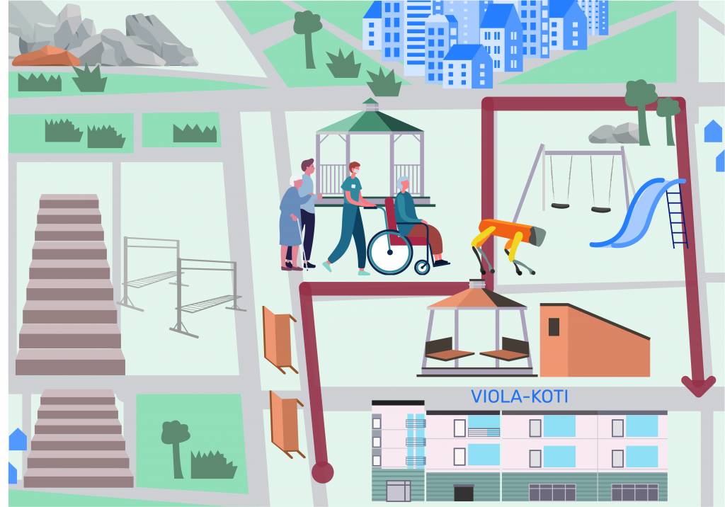 The pilot study started by introducing the agenda of the day, telling the story of TAssU’s naming (TAssU Spot Robonen), and sharing some photos of the Spot unveiling event and its agility contest that took place at Tampere University, Hervanta Campus. After the introduction, the seniors were instructed to head up to the inner yard of Viola-Koti, where TAssU was waiting for their arrival to have a walk in a chilling afternoon. During the walk route, TAssU was leading the walk and showed the route, and the walkers were following it. Three different activities were initiated along the walking route, including deep breathing exercises, upper body stretches, and TAssU robot show. The walk lasted for half an hour.