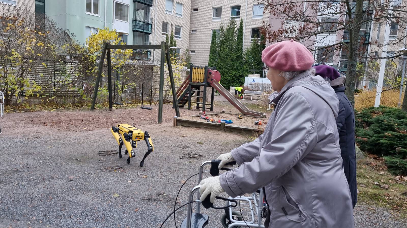 The pilot study started by introducing the agenda of the day, telling the story of TAssU’s naming (TAssU Spot Robonen), and sharing some photos of the Spot unveiling event and its agility contest that took place at Tampere University, Hervanta Campus. After the introduction, the seniors were instructed to head up to the inner yard of Viola-Koti, where TAssU was waiting for their arrival to have a walk in a chilling afternoon. During the walk route, TAssU was leading the walk and showed the route, and the walkers were following it. Three different activities were initiated along the walking route, including deep breathing exercises, upper body stretches, and TAssU robot show. The walk lasted for half an hour.