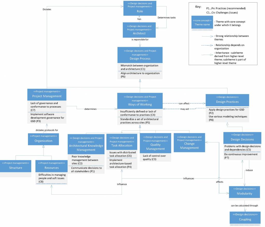 After a long and pain-stakingly systematic analysis and validation process (details can be found in our interview and analysis protocol, open access) we were able to produce a set of eight challenges and eight practices related to software architecture design. Each practice and challenge was further defined by concrete concerns. We redesigned the conceptual model from the SLR, and ended with the GSD Architectural Practice (GAP) Framework.