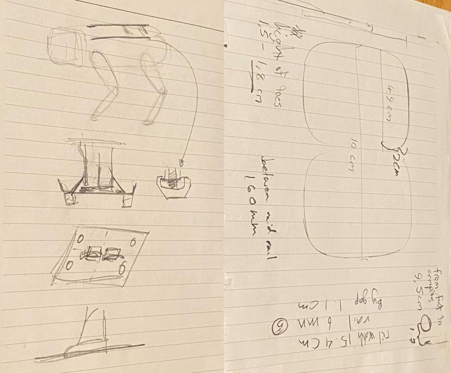 The first thing we did was sketching the design so we could have a rough concept idea. The basket design was first done on paper, with some dimensional details added in based on the Boston Dynamics developer documentation. As a small addition, the basket has slots for AlphaMini’s feet for AlphaMini’s safe attachment so it doesn’t fall off when Spot is moving.