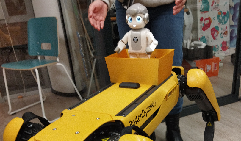 Our solution to this was to pair Spot with another robot who could do the talking in Spot’s place. The robot we chose was AlphaMini, a small humanoid robot that can be preprogrammed to do many activities, including speaking. The next issue we faced was how to make both of them seamlessly travel together. Thankfully Spot was made by a forward thinking team who had designed it in such a way that additional extensions may be quickly added. We used that to our advantage and created an accessory where AlphaMini could be carried easily and safely on Spot’s back.