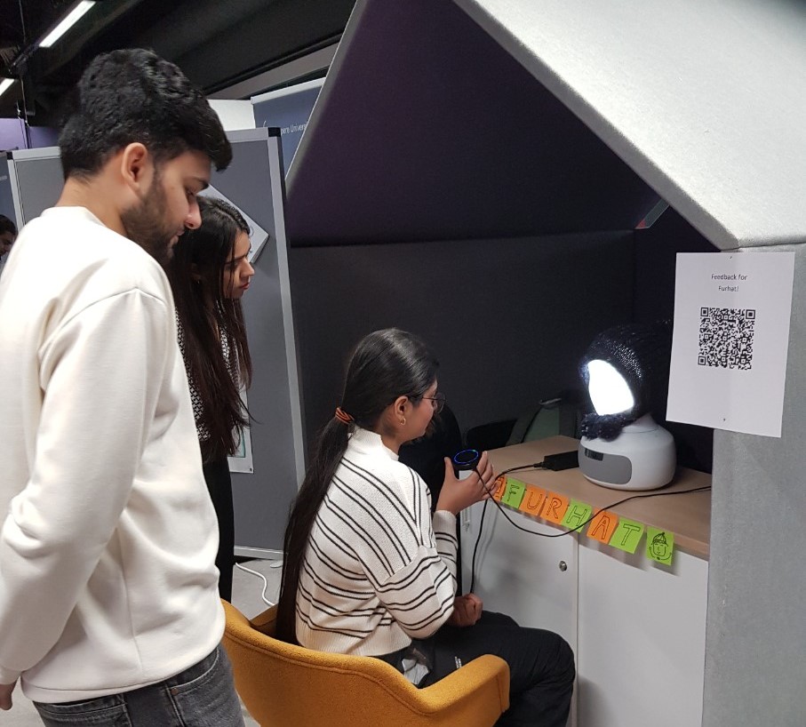 In the final Robo Carnival at Nokia Arena, we presented our concept design and had high schoolers experience the prototype. The reaction to Furhat’s appearance was overall positive, and the robot’s facial expressions made the interaction more natural and engaging. We also gathered feedback for our prototype iteration, including Furhat’s various accents, voice recognition, and sensitivity to background sounds.
