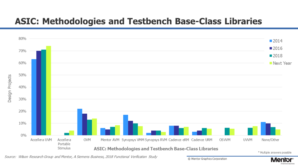 SystemVerilog and UVM are the current standards in SoC verification. UVM offers general conventions and ready building blocks for quick development of well-constructed and reusable verification environments on top of SystemVerilog language. Over 70% of ASIC verification in the industry is already done with UVM and the growth still continues [1].