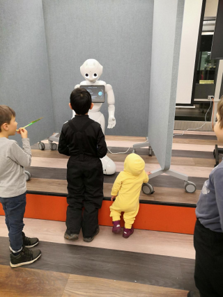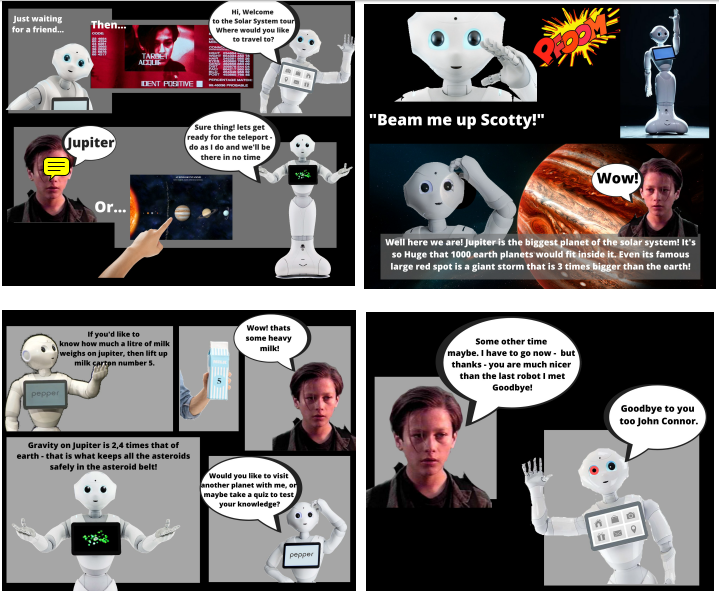 As a robotic platform we chose Pepper, due to the flexibility of possibilities for interactive presentation afforded by the combination of social dialog, tablet, gesture and sensors. In addition, the size and visibility of the robot made it ideal for attracting visitors and passers by. The application itself involved a free exploration of the planets of the solar system, whereby the end user could tell the robot either verbally or with touchscreen contol, where they wished to travel to and the robot would make a short presentation about each planet. The verbal presentation was supported by statistical data and visuals on the screen, as well as by prompted interaction with concrete examples and experiments in the surroundings.