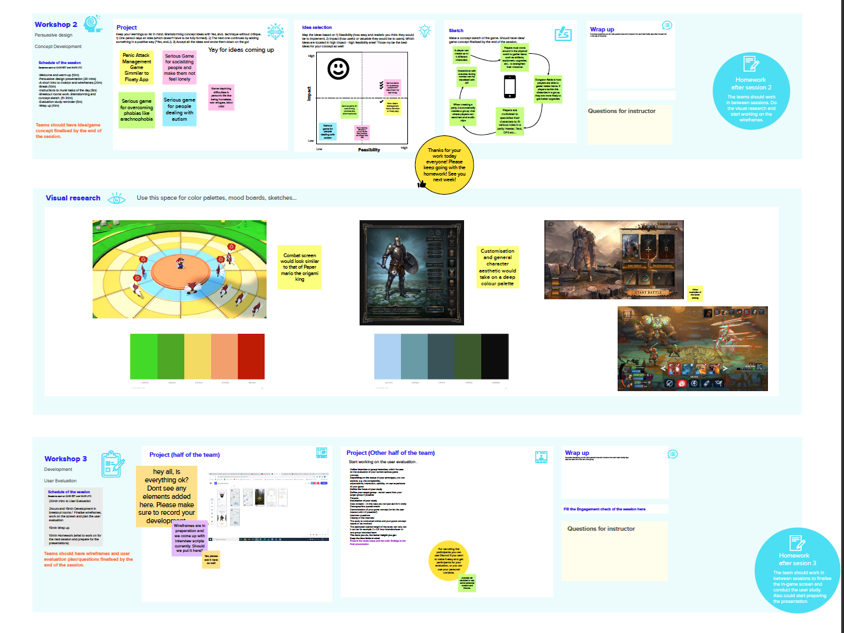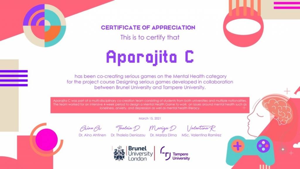 For four weeks, 30 students divided in six teams worked together to develop a game concept, visual research, mockups, and user evaluation. Guided by 4 members of staff courses, two from Tampere University Dr Aino Ahtinen and, MSc. Valentina Ramírez M, and from Brunel University Dr. Thaleia Deniozou, and Dr. Mariza Dima.