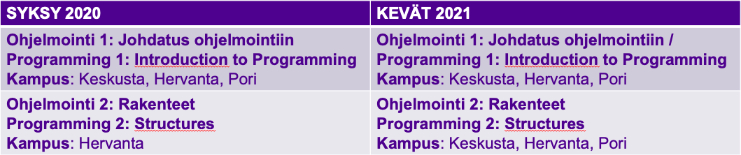 TIEA2.1A Olio-ohjelmoinnin perusteet I, TIEA2.1B Olio-ohjelmoinnin perusteet II ja TIETA11 Ohjelmoinnin tekniikka: C++.