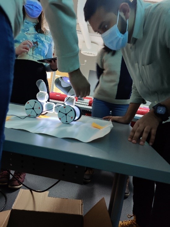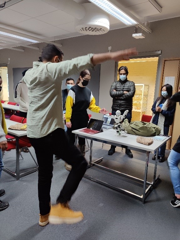 After the presentations, we had a half-an-hour demo session, where the in campus teams demonstrated their robotic demos. Half of the students were circulating on the stands and half of them were presenting at the time. Online students were following this part through the Teams link and by one person circulating between the demo stands with a mobile device. This part of the event was very funny. We saw impressive physical exercise movements conducted by Alpha 1E, a miniature barista robot implemented on ClicBot, a cute Alpha Mini as a sustainability educator (including nice humor), and another ClicBot acting as a fantasy creature to tell a story.