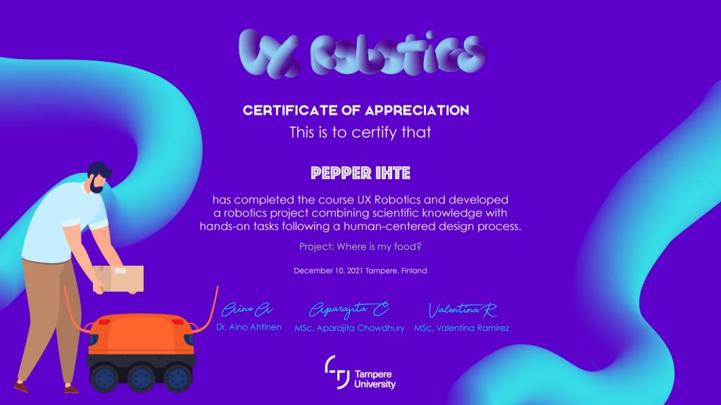 After the successful demo session we had the final ceremony of the course, where all of the students were provided a playful certificate for conducting the course, and it was time to close the course. Hopefully all of the participating students learned a lot about the robots, their design and evaluating them with the users, and hope to see you on board in the future as well!