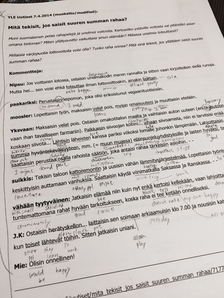 After that Ryoko showed me her Finnish homework and we went through the text and questions together. The text was about winning in the lottery and what you would do with the money.