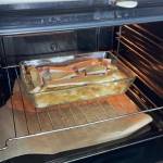 After the shopping, we started by peeling and slicing the potatoes and onions. After that, we had to fry the potatoes and onions for 15 Minutes before stacking them in a baking dish with crème fraîche and slices of cheese. After we were done, we placed everything in the oven for 20 minutes at 200 degrees.