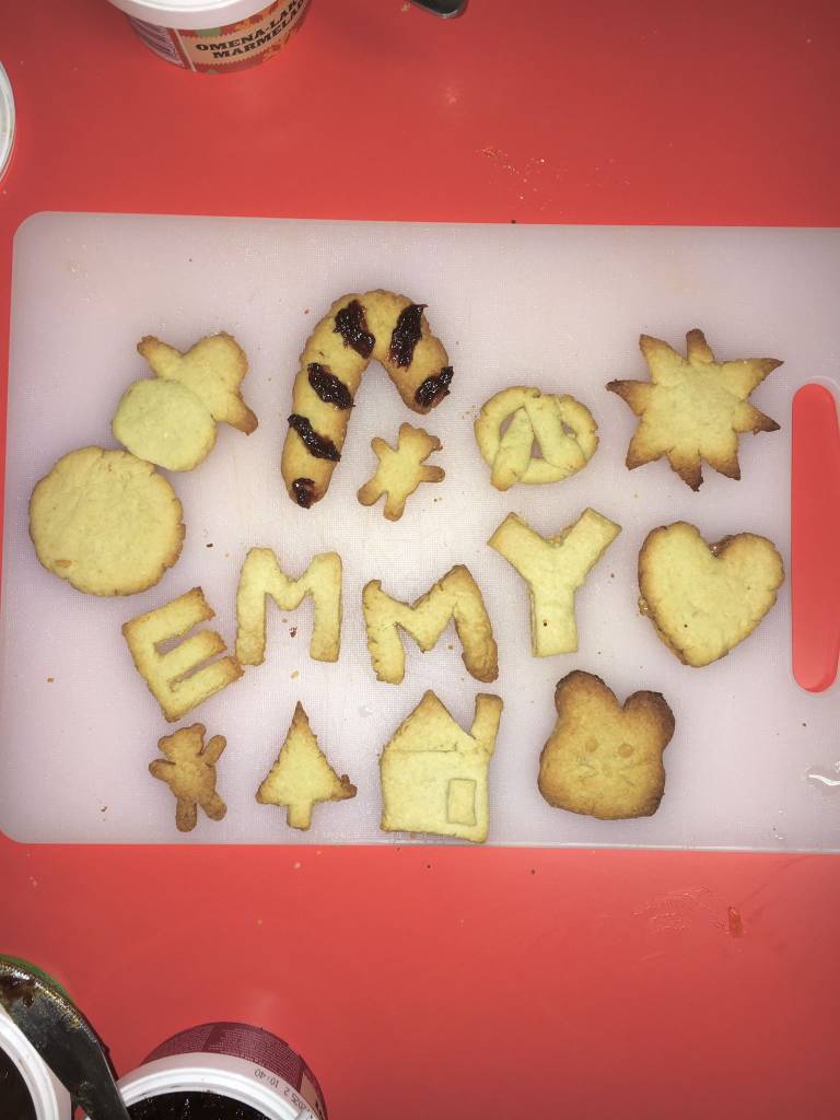 Today, it snowed in Tampere, so what better activity than something Christmas-related? We met at Emese’s place to bake Christmas cookies. We started by cutting the dough into shapes like stars, snowmen, candy canes, and more. While I kept my designs classic, Minju impressed us with her artistic talent, making shapes like envelopes, bow ties, and even Santa Claus!