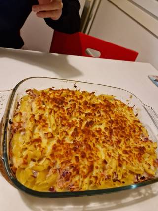 For the 10th and final meeting me and Max met up to cook a typical pasta that Max makes with his family. His grandma used to make this pasta for his mother when she was younger, and his mother teached him how to make this pasta. The ingredients for the pasta are: Pasta (or how Max calls it, Noodles), A lot of Cheese, Ham, Onions, Spices, Cream, Garlic and Eggs. The pasta tasted very good and Max told me about other dishes he makes a lot with his family. It was very nice to do this with him for our final meeting.
