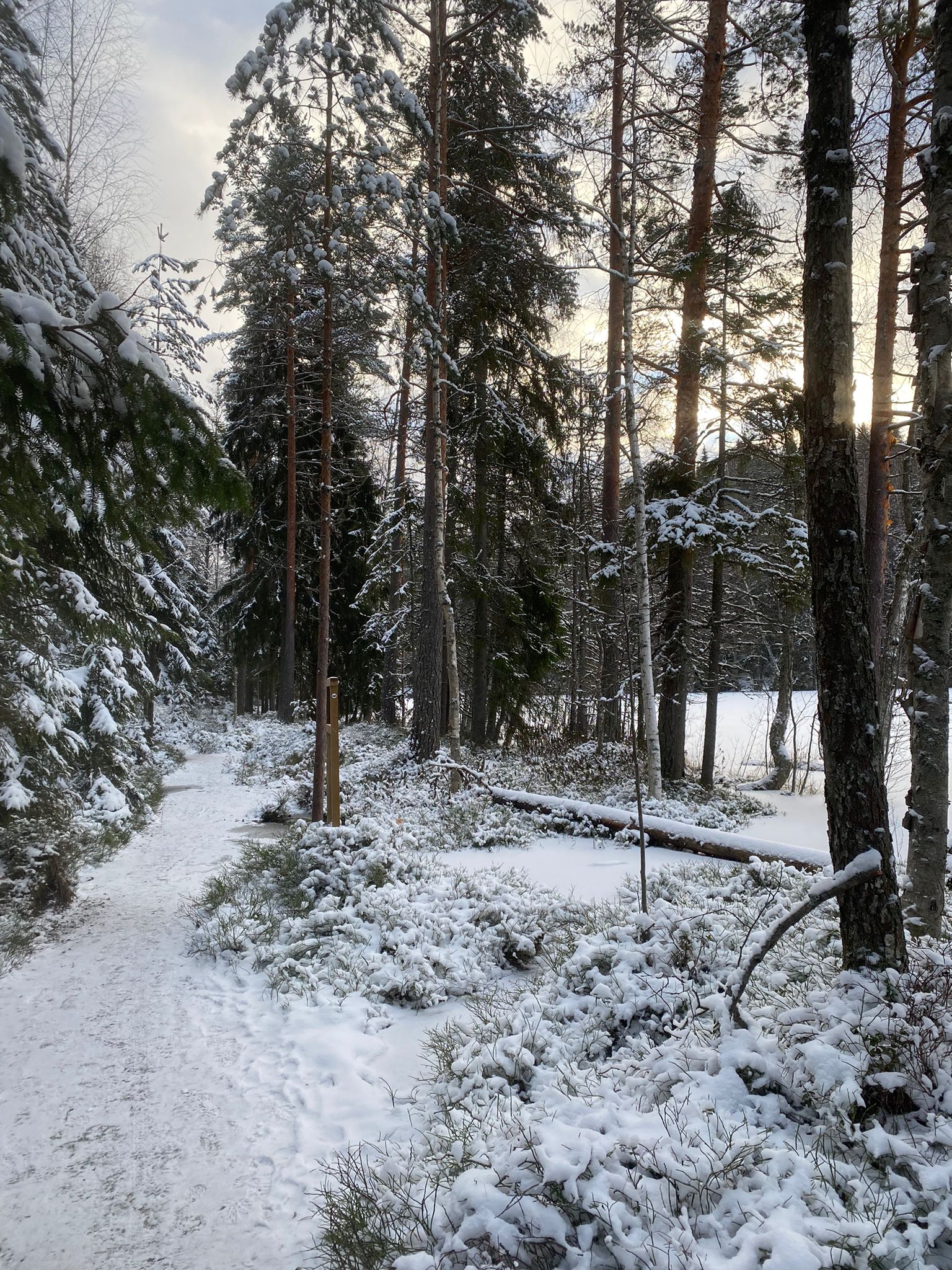 Last weekend, it had snowed again in Tampere, and Eire and I spontaneously decided to meet up for a walk in the woods. Neither of us had tried this hiking route to Lake Suolijarvi before, so we had the chance to discover many new things along the way. We also came across a small hut where we could make a fire to warm up a bit. On our journey, we exchanged many new vocabulary words related to nature, the forest, and winter. We walked for over three hours, and despite the cold weather, it was a lot of fun.