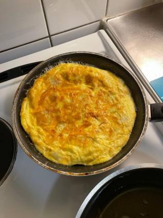 We prepare the most typical Spanish dish, a potato omelette. We cooked it on the spot. It consists of beating eggs together with chopped fried potatoes and making an omelette. Laura and Chiara told us that they liked it very much. In addition, to accompany the dinner we had toasted bread with tomato and olive oil, with Manchego cheese on top. We noticed that in Germany as well as in Spain it is very common to use bread for cooking. In addition, we bought olives and gherkins as a snack for the table.