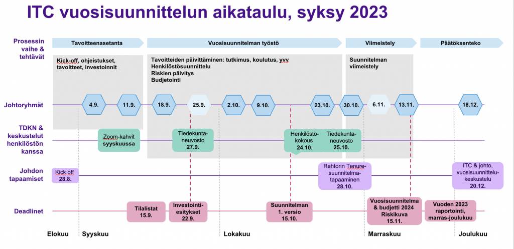 Johtoryhmän kokous keskittyy vuosisuunnitteluun, paikalla on myös vuoden 2024 alusta dekaaniksi palaava Jyrki Vuorinen. Vuosisuunnitelman luonnos on käsiteltävänä henkilöstökokouksessa 24.10.2023.