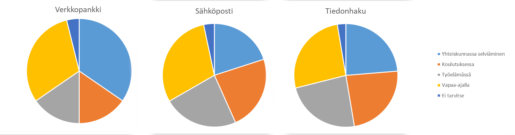 Ohjaajien ja valmentautujien vastaukset kyselyyn olivat todella samansuuntaisia. Vastaajat kokivat tärkeimmiksi digitaidoiksi verkkopankin, sähköpostin ja tiedonhaun. Verkkopankin merkitys korostui erityisesti yhteiskunnassa selviytymisessä. Sähköpostia tarvitaan erityisesti vapaa-ajalla, työssä ja koulutuksessa sekä jonkin verran yhteiskunnassa. Tiedonhaun taitoja tarvitaan aktiivisesti kaikissa erilaisissa elämäntilanteissa.
