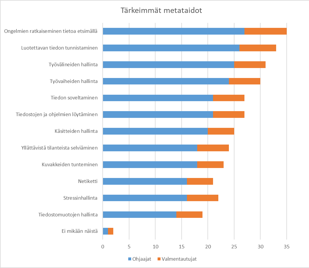 Metataidoilla tarkoitetaan taitoja, jotka vaikuttavat työskentelyymme ja oppimiseen. Valmentautujat kokivat tärkeimmiksi digitaitojen metataidoiksi kyvyn ratkaista ongelmia tietoa etsimällä ja luotettavan tiedon tunnistamisen. Näiden lisäksi ohjaajat kokivat työvälineiden ja työvaiheiden hallinnan tärkeimmiksi taidoiksi.
