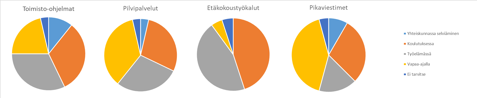 Tärkeitä digitaitoja, joiden merkitys korostuu koulutuksessa ja työelämässä, ovat toimisto-ohjelmien hallinta, pilvipalvelut ja etäkokoustyökalut. Ohjaajat kokivat etäkokoustyökalut hieman tärkeämmiksi kuin asiakkaat. Asiakkaat taas kokivat pilvipalvelut tärkeämmiksi kuin ohjaajat ja heidän mukaansa niille on paljon käyttöä myös vapaa-ajalla. Pilvipalveluiden lisäksi pikaviestimien käyttö on tärkeä vapaa-ajan digitaito.
