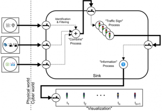 Kuvassa 2 näkyy esimerkki, jossa kolmea erityyppistä tietolähdettä yhdistellään toisiinsa ”yhdistely”-muuntelupisteen prosessin avulla. Yhdistetty data kulkee uuden syklin, ja päätyy sarjaan joka kuvaa useammasta ”liikennevalo”-muuntelupisteestä koostuvaa prosessia. Tämän prosessin tuotos ohjataan vielä ”informaatio”-prosessiin josta se suuntaa tiensä toiseen allasmallikelpoiseen visualisointijärjestelmään.