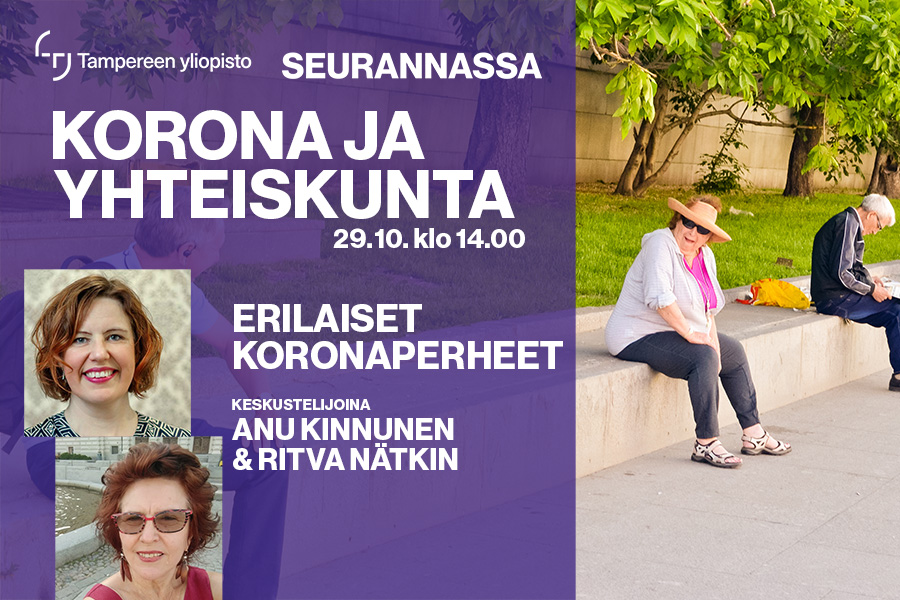 Keskustelemassa tutkija Anu Kinnunen Singlehood studies-verkostosta ja Tampereen yliopiston sosiaalipolitiikan yliopistonlehtori Ritva Nätkin (lue Nätkinin ja Hannele Forsbergin juttu Korona-aika: perhe ja valtio huolenpitokriisejä ratkaisemassa Alustalta.