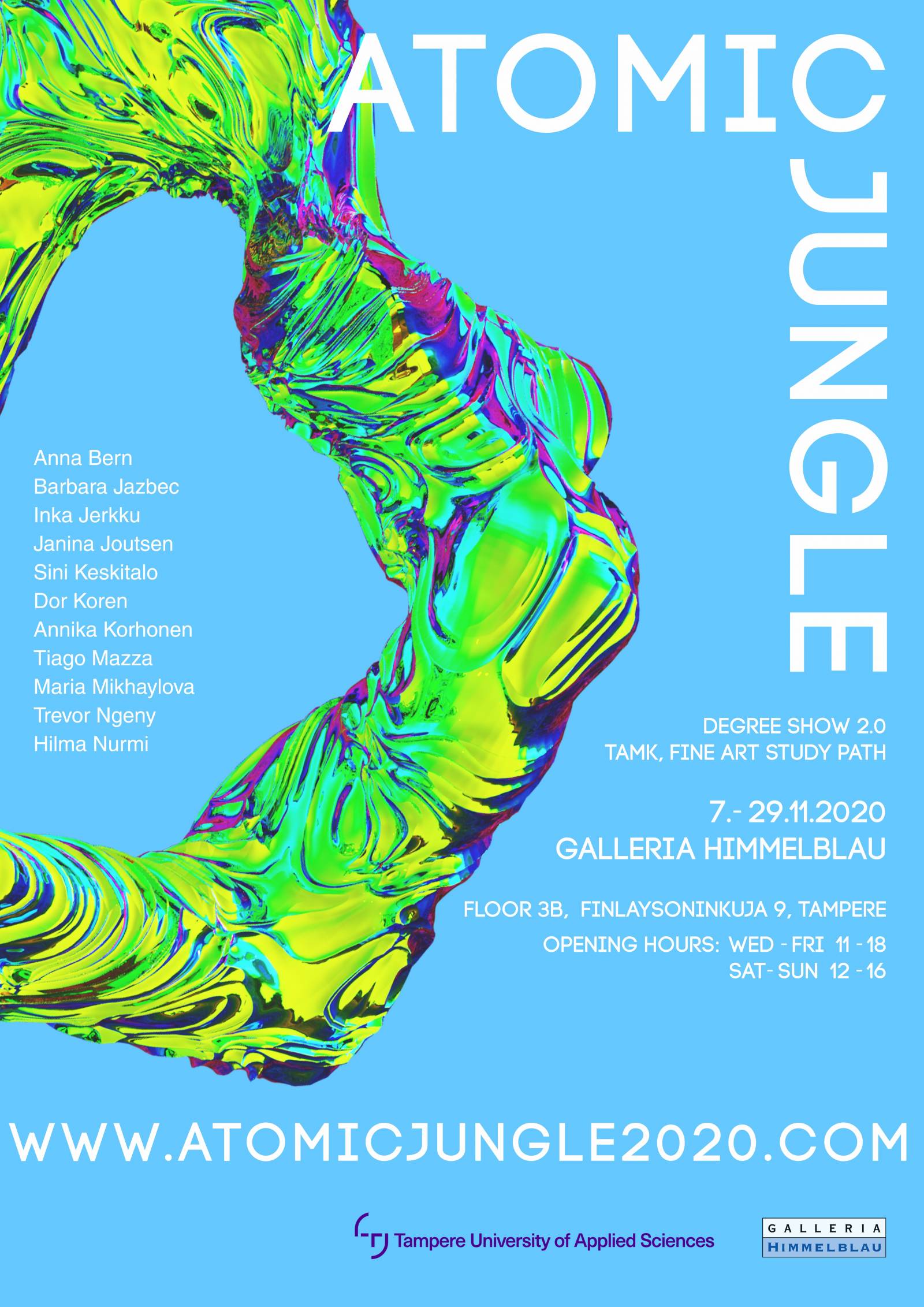 Atomic Jungle brings together this year’s graduating fine art students: Anna Bern, Barbara Jazbec, Inka Jerkku, Janina Joutsen, Sini Keskitalo, Dor Koren, Annika Korhonen, Tiago Mazza, Maria Mikhaylova, Trevor Ngeny