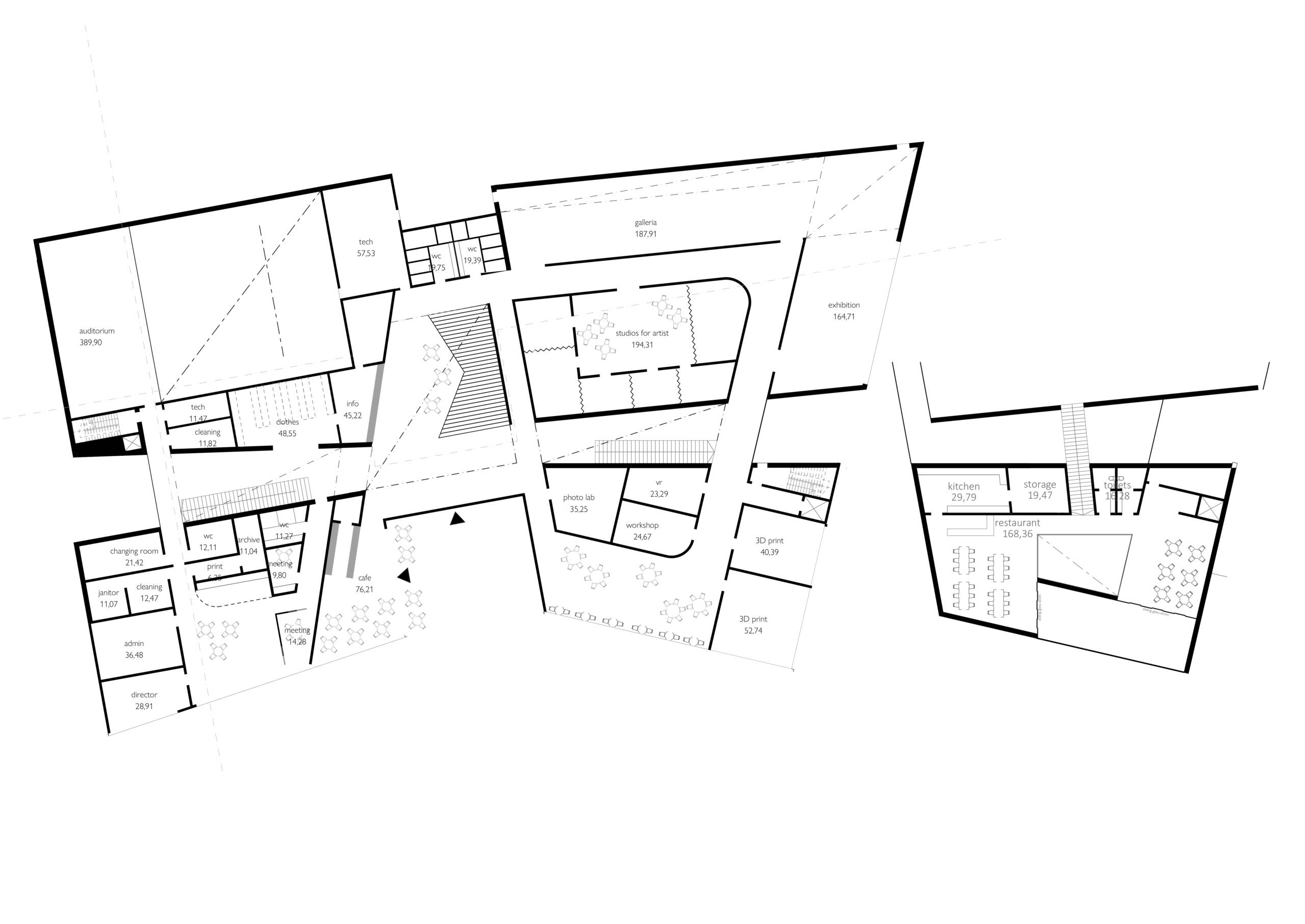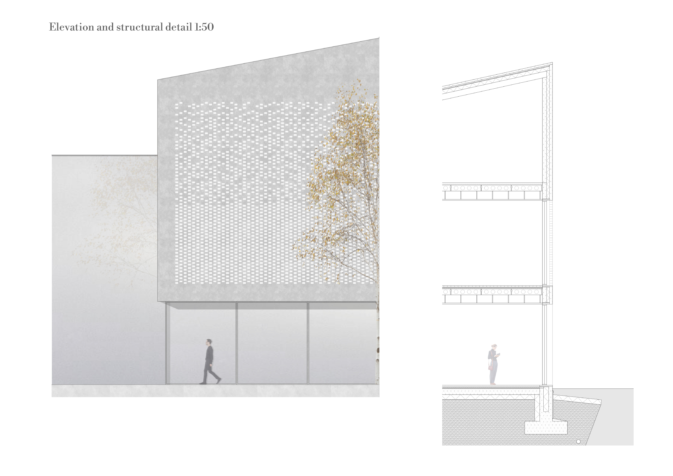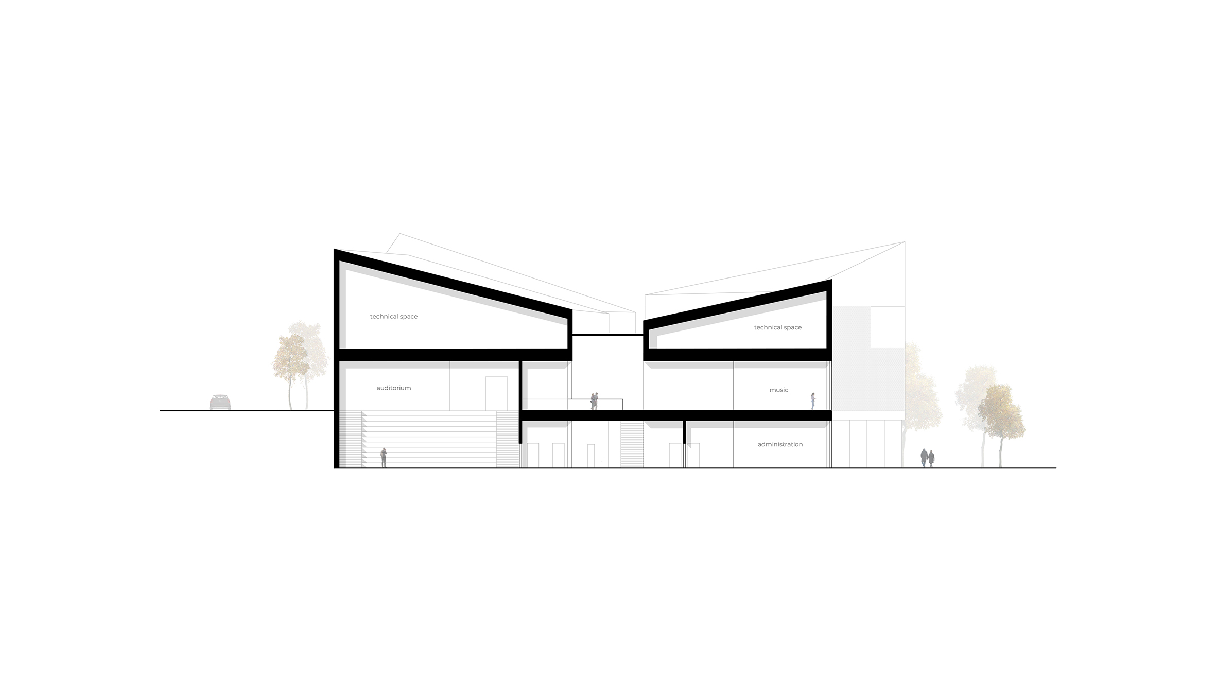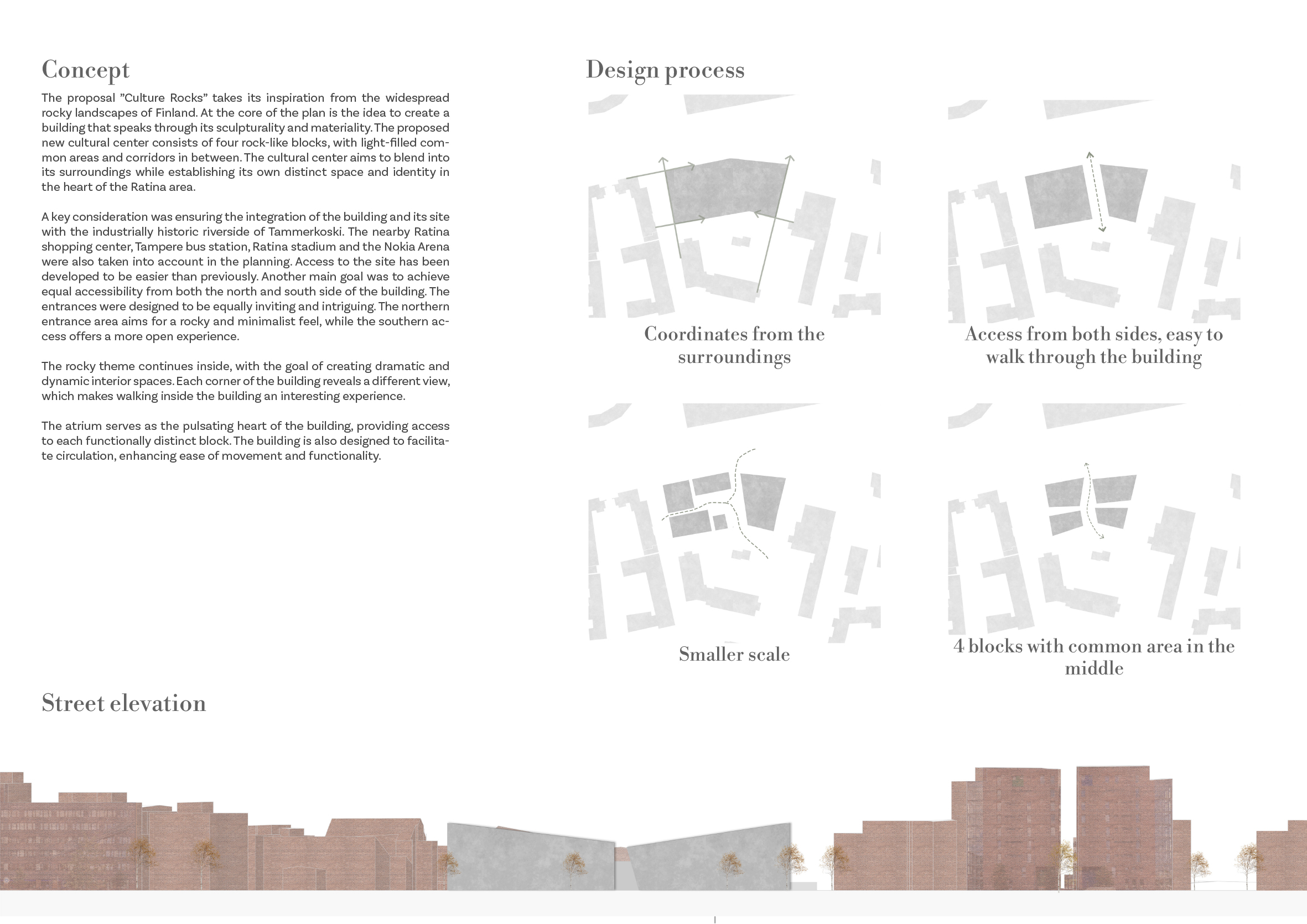The proposal “Culture Rocks” takes its inspiration from the widespread rocky landscapes of Finland. At the core of the plan is the idea to create a building that speaks through its sculpturality and materiality. The proposed new cultural center consists of four rock-like blocks, with light-filled common areas and corridors in between. The cultural center aims to blend into its surroundings while establishing its own distinct space and identity in the heart of the Ratina area.