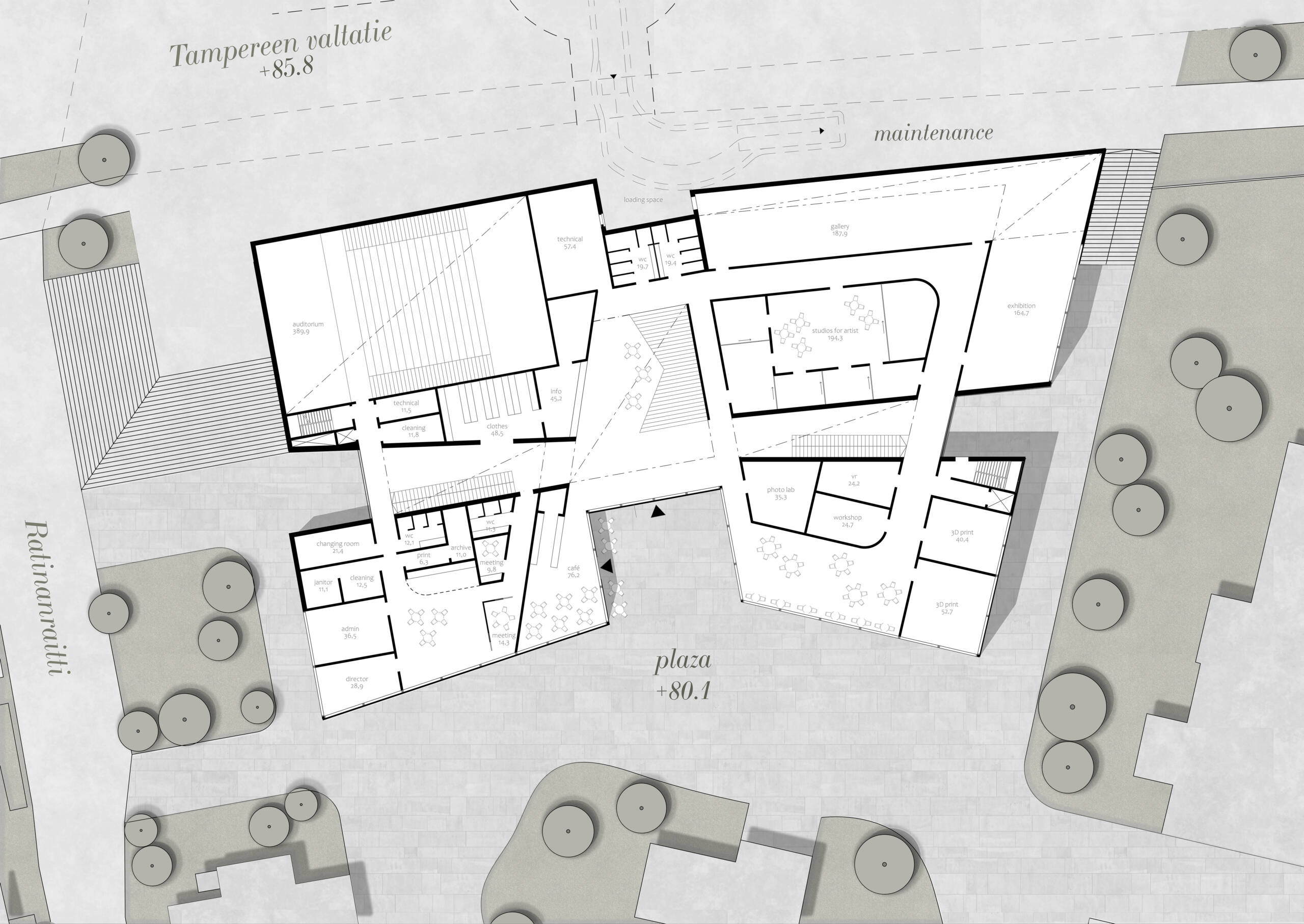 A key consideration was ensuring the integration of the building and its site with the industrially historic riverside of Tammerkoski. The nearby Ratina shopping center, Tampere bus station, Ratina stadium and the Nokia Arena were also taken into account in the planning. Access to the site has been developed to be easier than previously. Another main goal was to achieve equal accessibility from both the north and south side of the building. The entrances were designed to be equally inviting and intriguing. The northern entrance area aims for a rocky and minimalist feel, while the southern access offers a more open experience.
