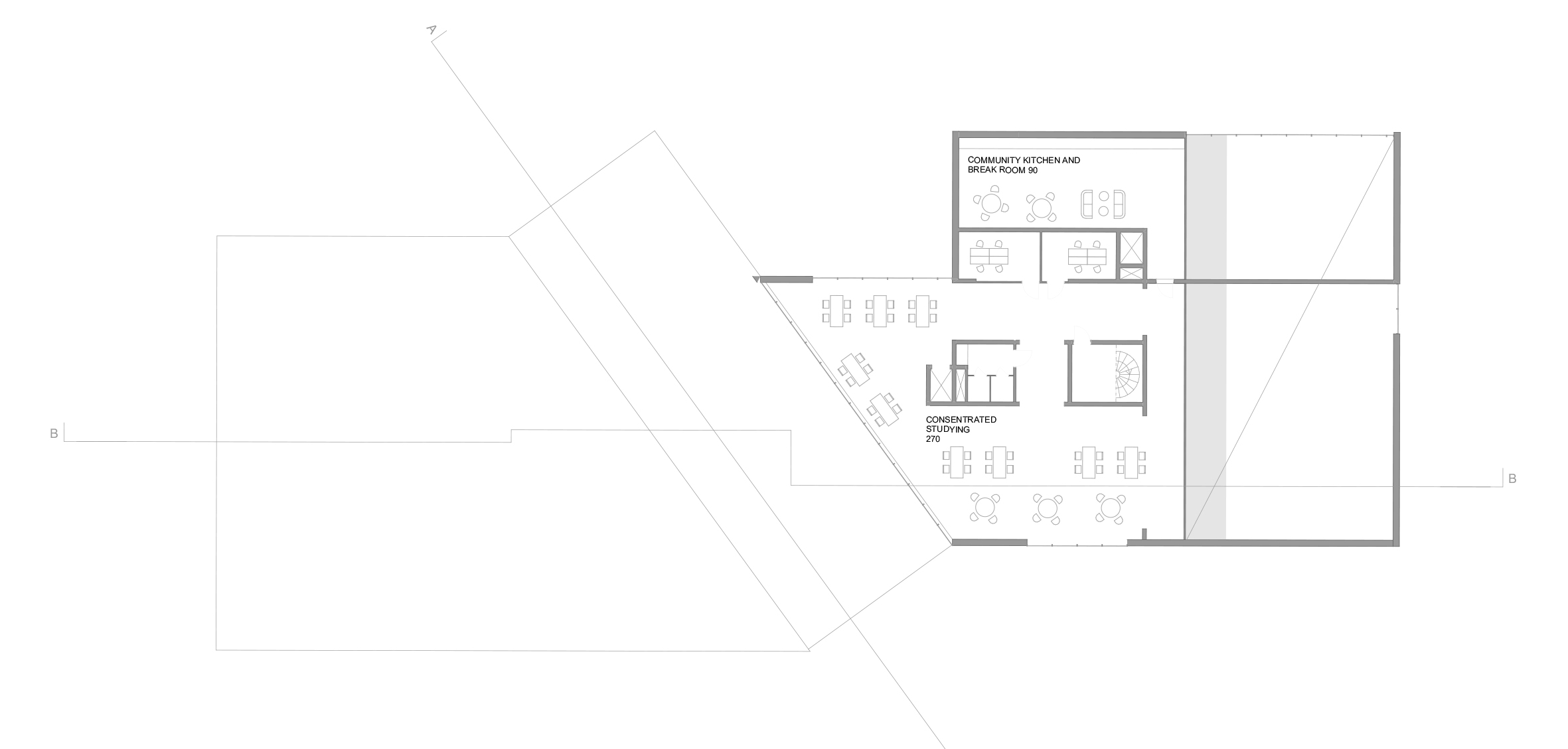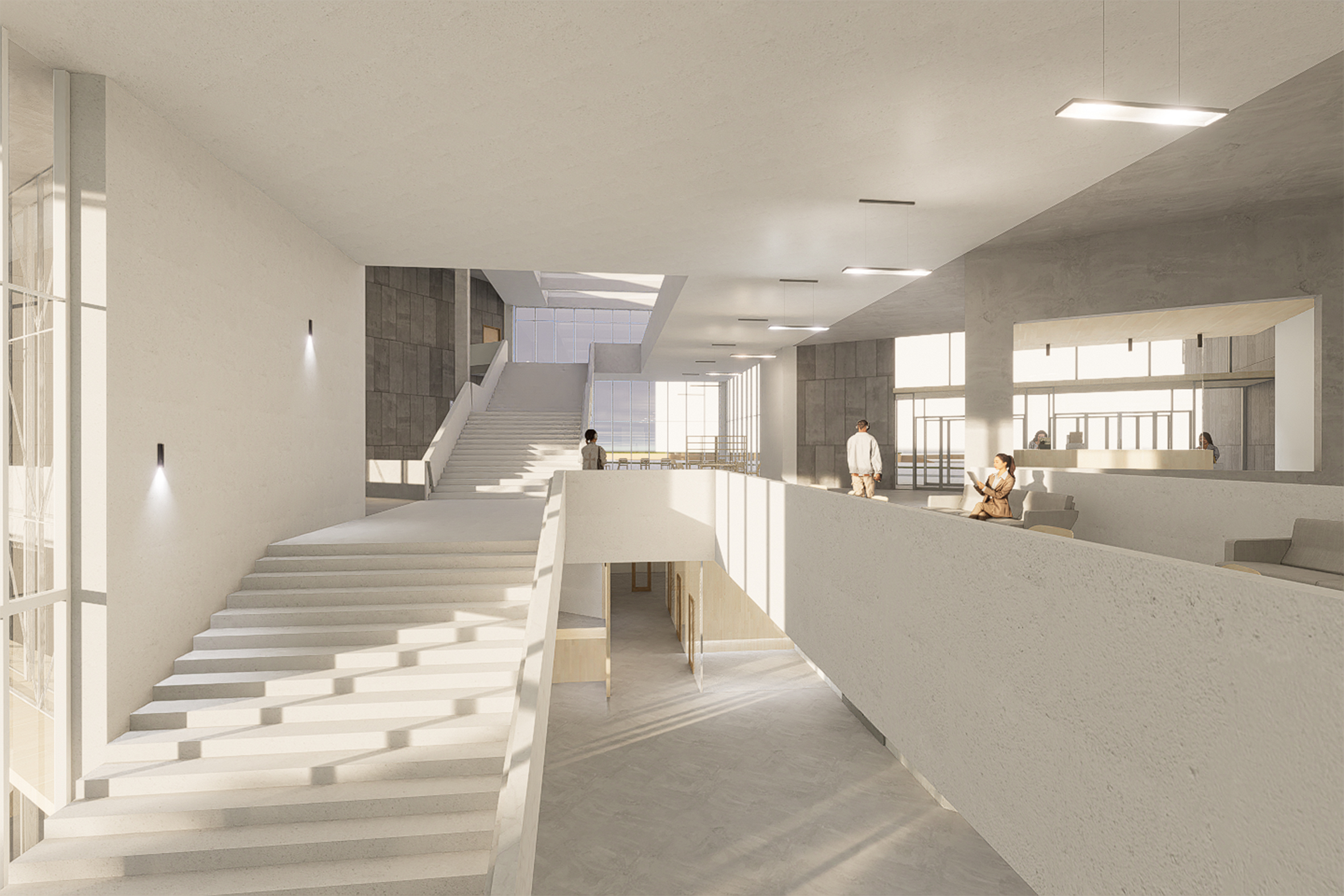 The two atriums on two floors are connected vertically in a three-floor high room. The staircase from the first floor forms a luring pathway with skylight that enables a straight-forward route through all three floors and the opportunity to stop and experience the functions and views offered by both spaces and voids.