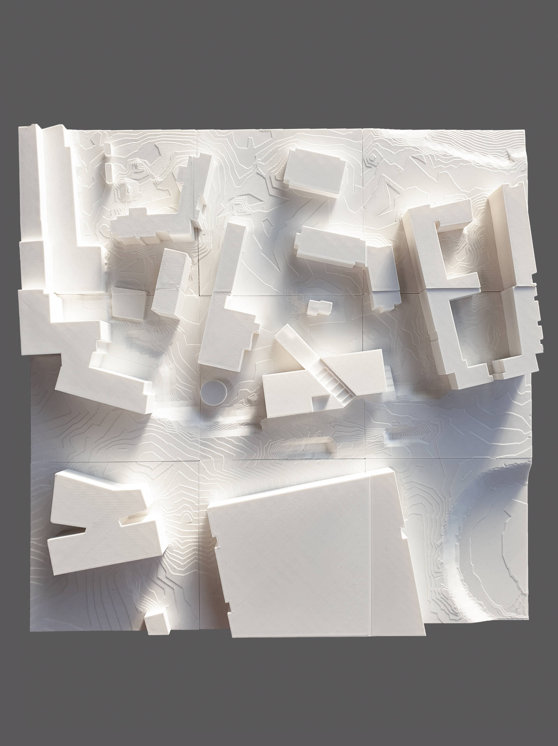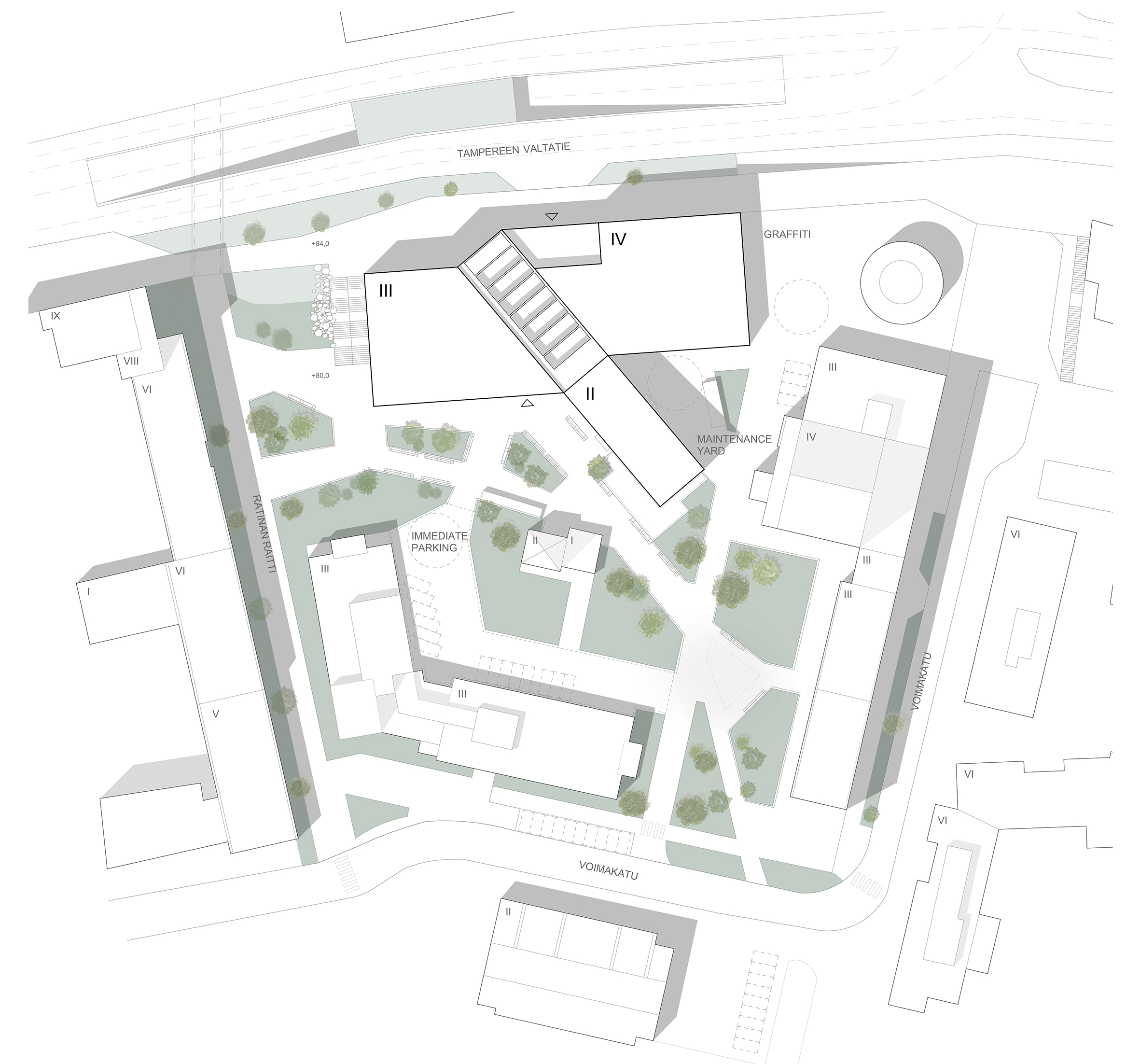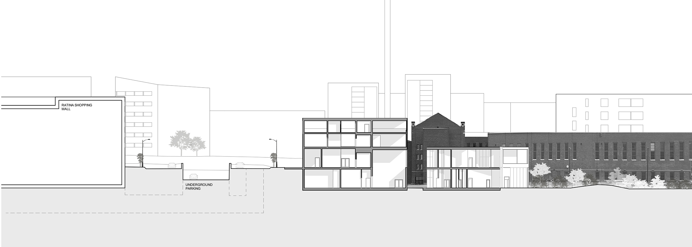Structurally the side wings are supported by load bearing walls that play a part in dividing the masses into wider and narrower spaces, bridges and corridors. The narrow middle mass consists of pillars and bars, which allows the structure to be lighter and more transparent.